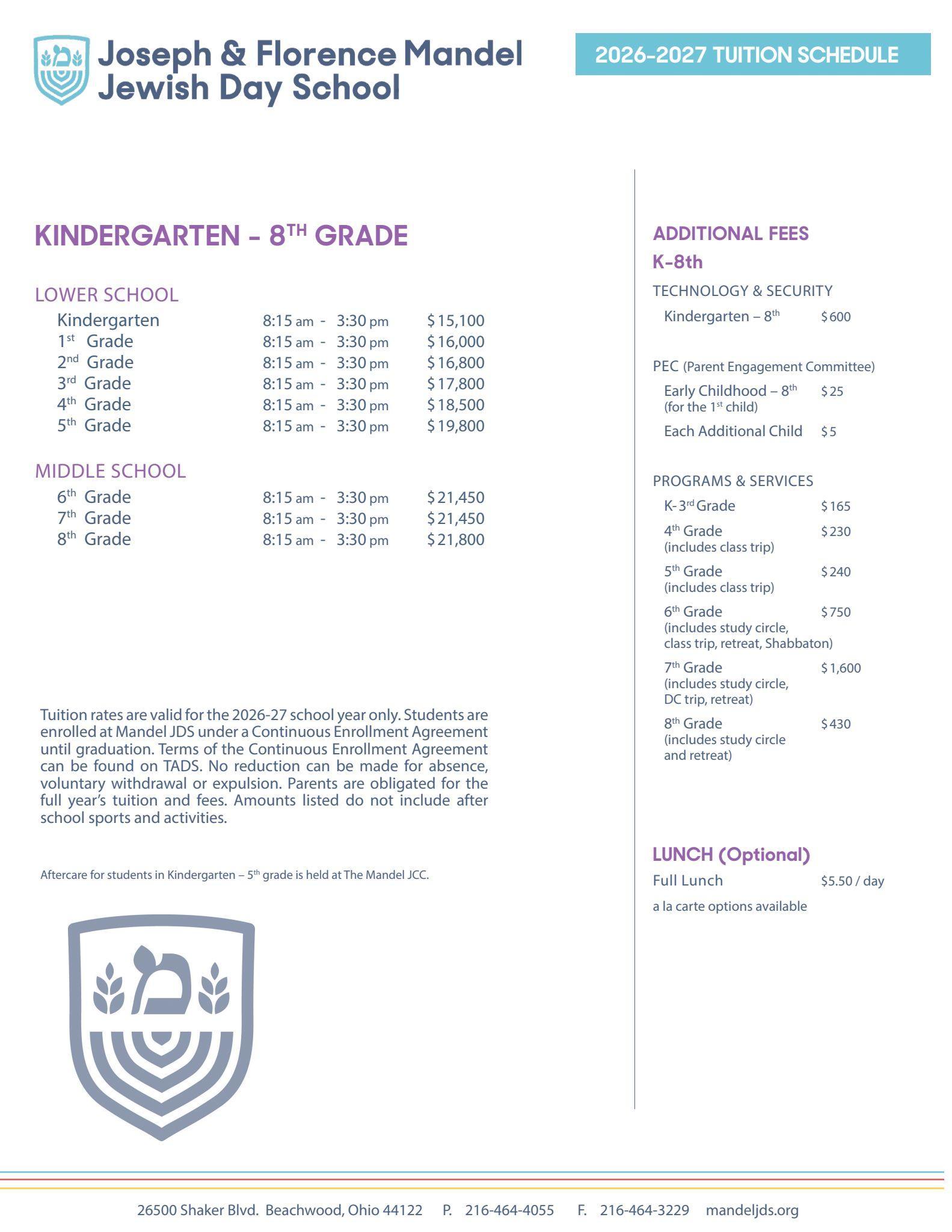 The Mandel JDS Affordability Initiative was created for families with an adjusted gross income (AGI) between $150,000 to $300,000 per year, most of which is from W-2 sources, i.e. not self employed businesses. Families who fall within this range will receive a capped tuition total, which is 12% of their AGI, regardless of the number of children they have enrolled in the school.